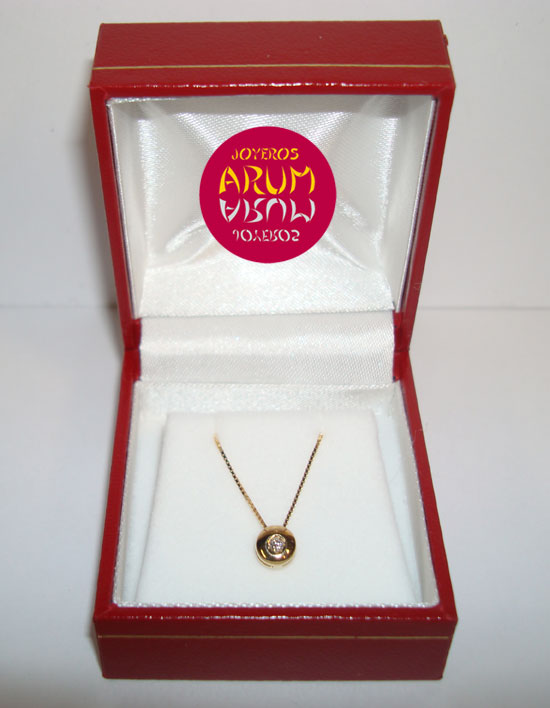 Product: Yellow gold necklace with brilliant 0,05 qtsReference: ARUM-CAMaterial: Yellow gold 18 qts Brilliant weight: 0,05 qts.Colour: HClarity: VS1Cut: Brilliant
