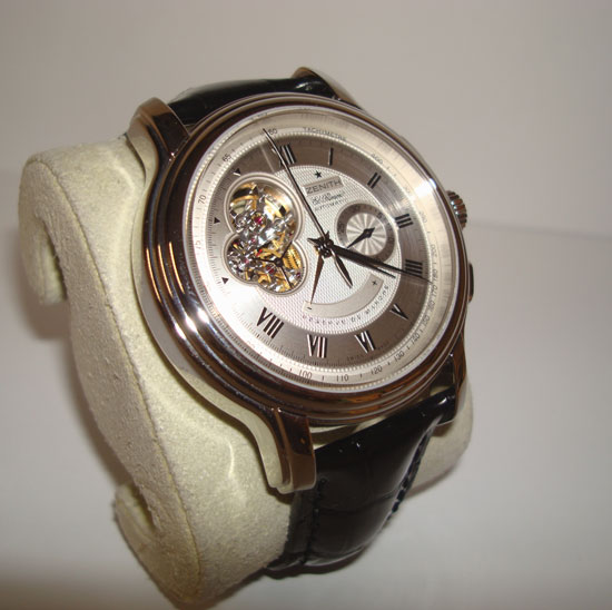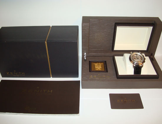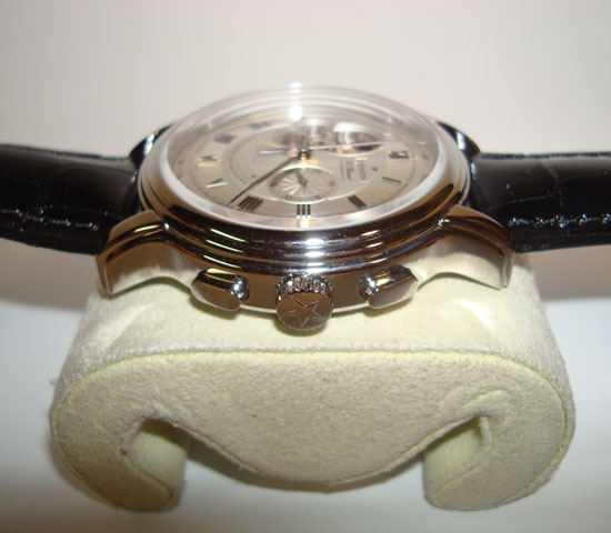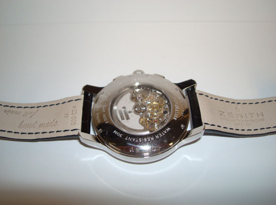 Description :steel, automatic, sapphire crystal, chronograph, chronometer, tachymeter, power reserve indicator, water resistant 30 meters, diameter 44 mm, screw crown and two buttons, transparent back cover, leather strap, folding closure.