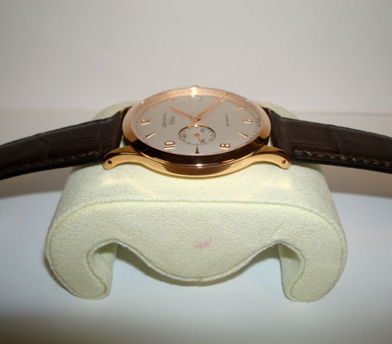 Description :rose gold, white dial, sapphire crystal, automatic movement, small seconds at nine, date at three o’clock, screw crown, diameter 36 mm, waterproof 30 meters, transparent caseback, leather strap brown, gold folding clasp.