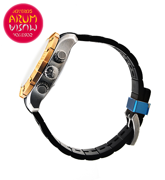 Other specifications :rotating bezel, chronograph, power reserve indicator at six, small seconds at nine, open window, screw crown and buttons, luminiscence indicators, transparent caseback.
