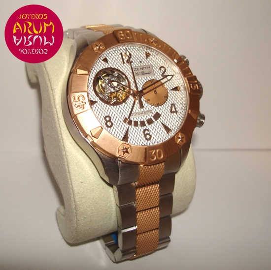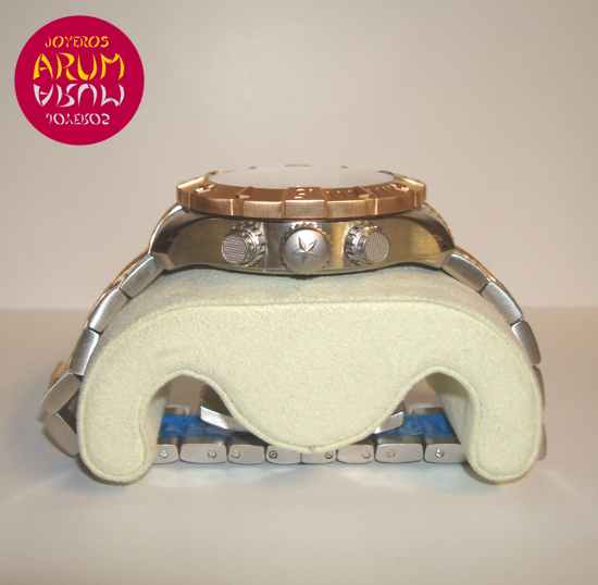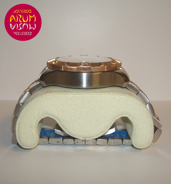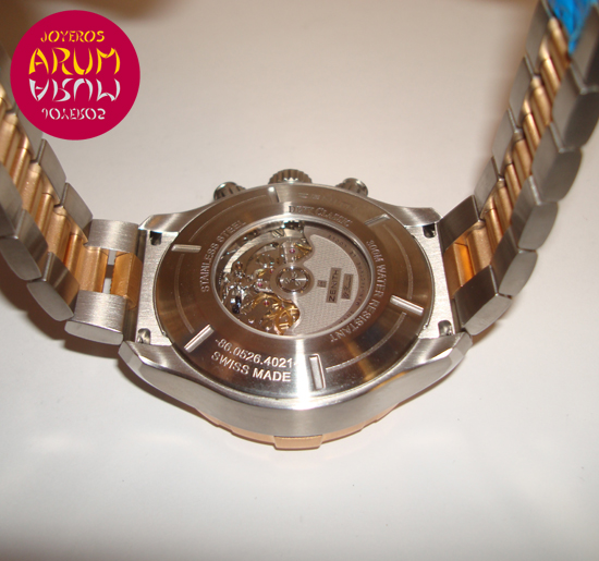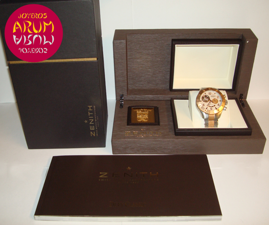 Description :steel and rose gold, white dial, sapphire crystal, rotating bezel, automatic movement, caliber 4021 Zenith SC, power reserve 55 hours, chronograph. minutes indicator at three, power reserve indicator at six, crown and screw buttons, transparent back, diameter 46.5 mm, waterproof 300 meters, steel strap and rose gold, hidden folding clasp.