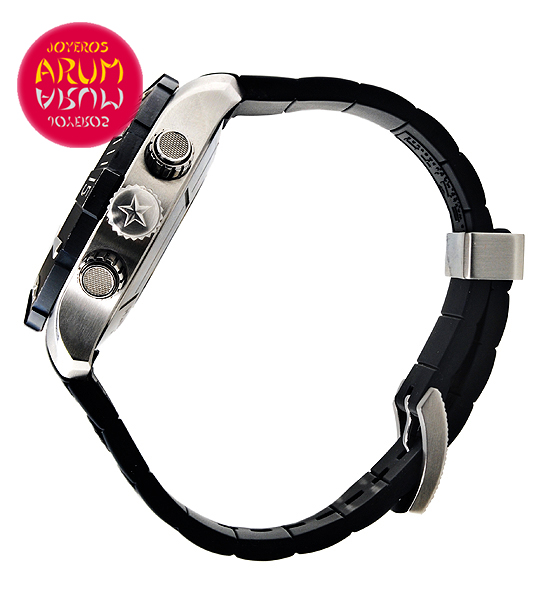 Other specifications :limited edition 250 pieces, rotating bezel, chronograph, date between four and five, small seconds at nine, minute chronograph counter at three, hour chronograph counter at six, luminiscence, screw crown, transparent caseback, year 2008.