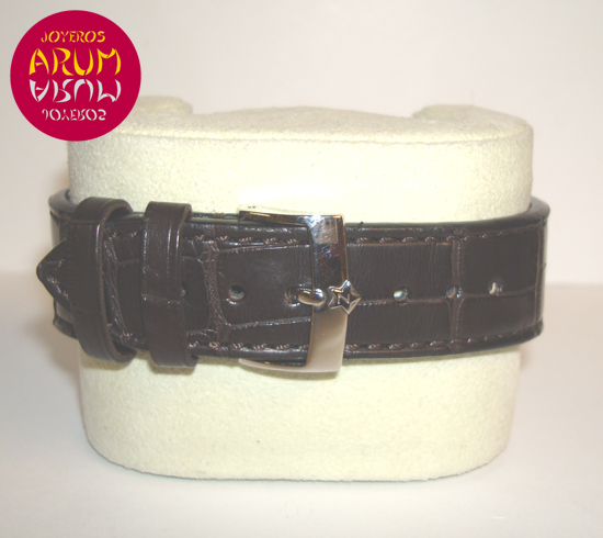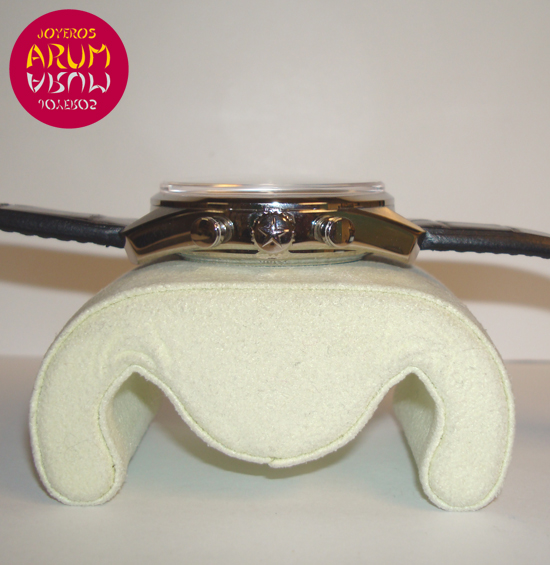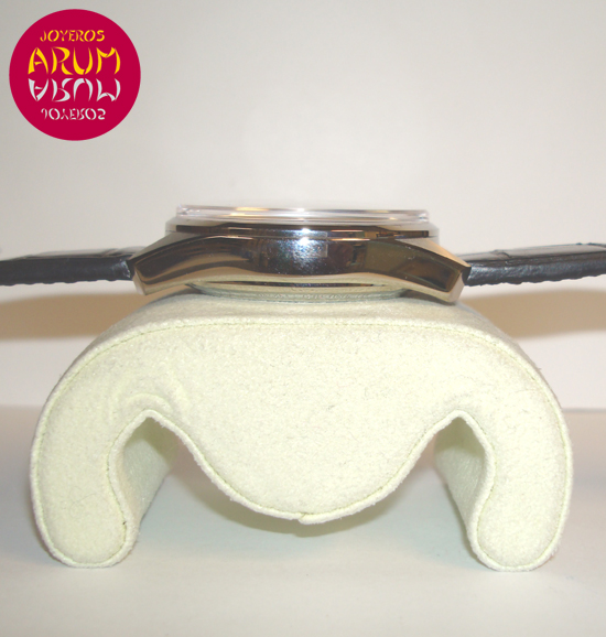 Description :steel, silver dial, smooth bezel, sapphire crystal, automatic movement, chronograph, minutes indicator at three, small seconds at nine, power reserve indicator between five and eight, tachometer, handles and dial with luminescent indicators , screw crown and two buttons at right, transparent back, diameter 42 mm, waterproof 100 meters, leather strap, steel buckle closure.