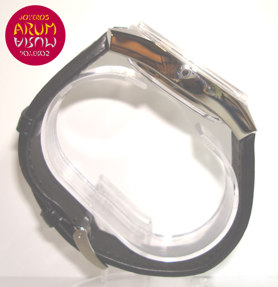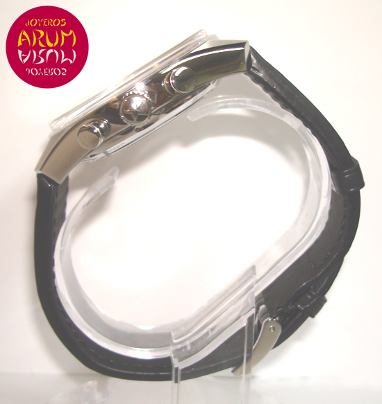 Description :steel, silver dial, smooth bezel, plastic crystal, automatic movement, chronograph, three indicators on the dial, minute at three, hours at six, small seconds at nine, window between eight and twelve to see the skeleton machine, tachymeter, luminescent handles and indicators, transparent caseback, screw crown and two buttons, diameter 42 mm, waterproof 100 meters, black leather strap, buckle closure.