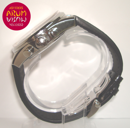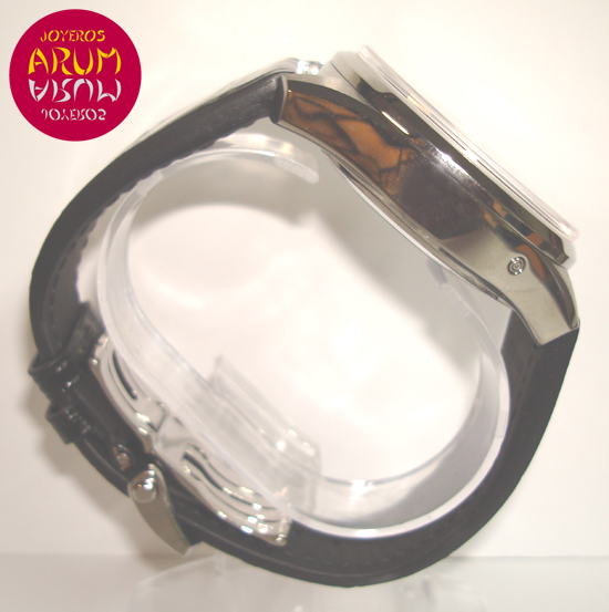 Description :steel, black dial, smooth bezel, sapphire crystal, automatic movement, caliber 4047, power reserve of 50 hours, chronograph, date at two, minutes chrono indicator at three, moon phase at six, open window show the skeleton of the machine between nine and twelve, tachymeter, luminescent handles, transparent caseback, diameter 45 mm, waterproof 100 meters, brown leather strap, folding clasp.