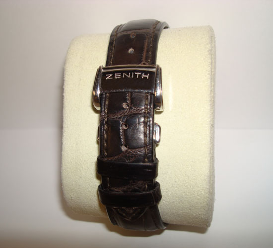 Description :steel, white dial with, 3 indicators, seconds, minutes and hours, chronograph, day of week and month with letter, number date, tachimeter, automatic movement, sapphire crystal, diameter 42 mm, transparent back cap, strap leather, steel folding clasp.