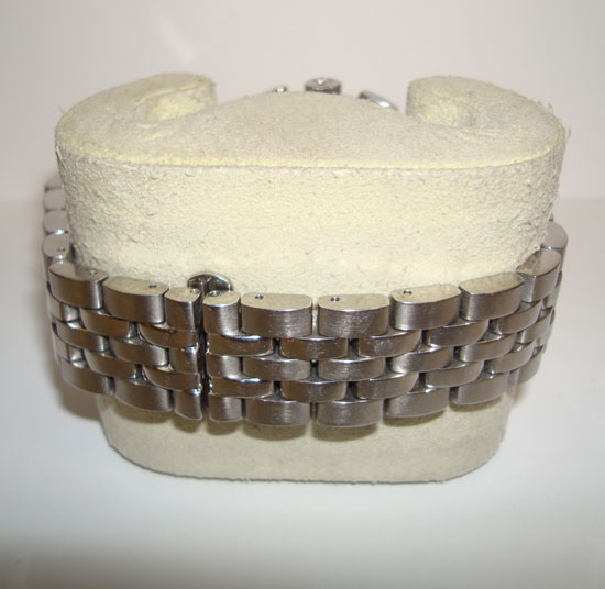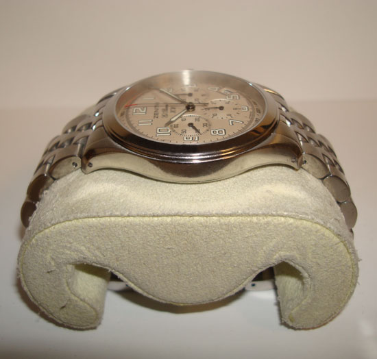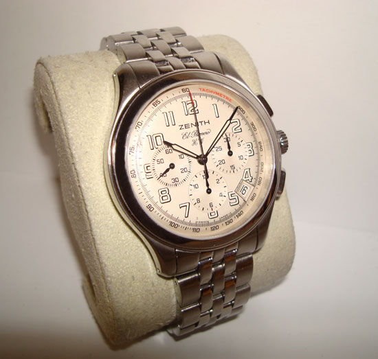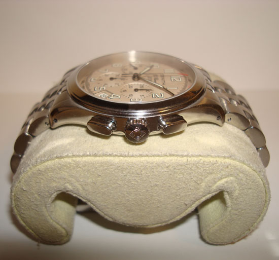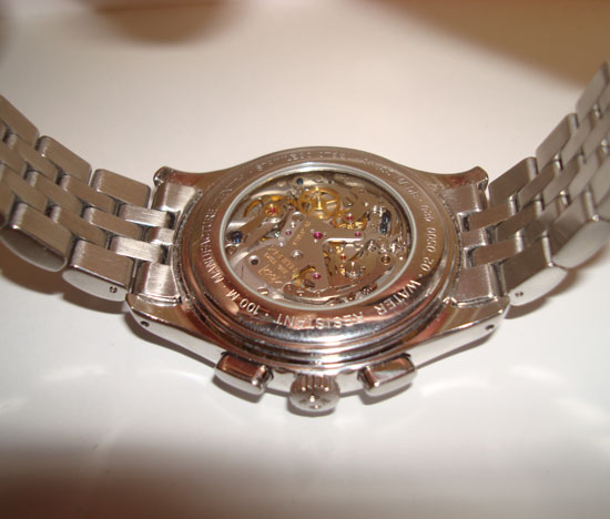 Description :steel, white dial, sapphire crystal, manualmmovement, chronograph, three indicators on the dial, seconds, minutes, hours, date between four and five, handles and luminescent dial, screw crown and two buttons, diameter 40 mm, transparent back cover, steel strap, hidden folding clasp.