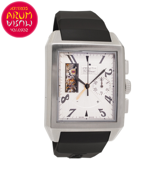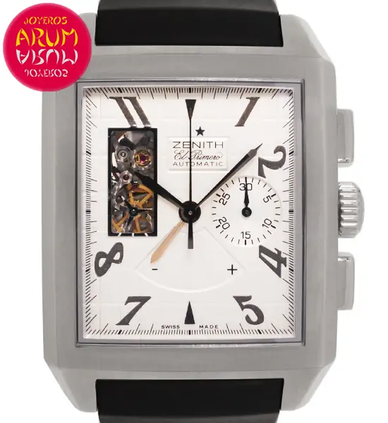 Other specifications :calibre Zenith 4021, power reserve 55 hours, chronograph, power reserve indicator at six, small seconds at nine, transparent caseback. Year 2007.