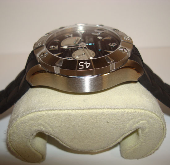 Description :steel, unidirectional rotating bezel with numeric scale, sapphire crystal, black dial, automatic movement, small seconds, power reserve indicator, date with magnifying glass, luminescent indicators, screw crown, water resistant 300 meters, diameter 43 mm, transparent caseback, rubber strap, steel buckle closure.