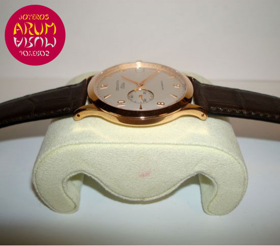 Description :rose gold, white dial, sapphire crystal, automatic movement, small seconds at nine o’clock, date at three, screw crown, diameter 36 mm, waterproof 30 meters, transparent caseback, brown leather strap, rose gold folding clasp.
