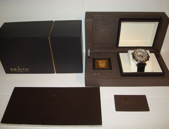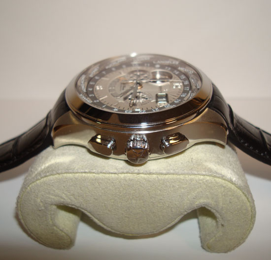 Description :steel case, sapphire crystal, automatic movement, chronograph, date, world time complication to show the time simultaneously in 24 cities over the world, power reserve indicator, power reserve of 50 hours, 50 meters underwater, 46 mm diameter, screw crown and two buttons to the right, and one located at ten, transparent caseback, black leather strap, steel folding clasp.