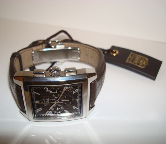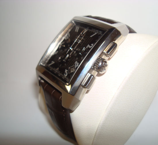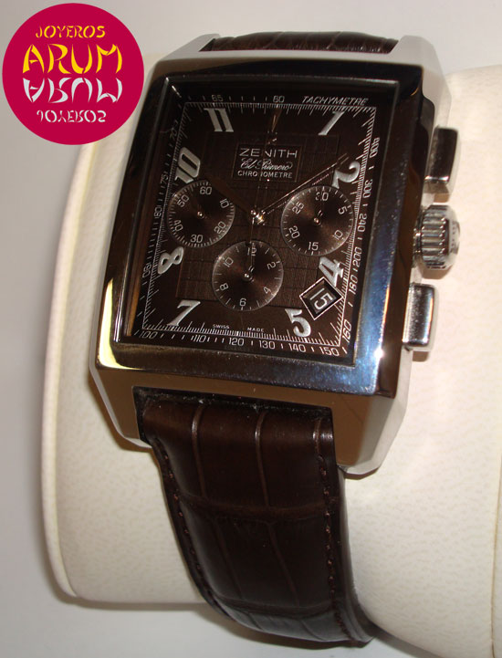 Description :steel, sapphire crystal, brown dial, automatic movement, chronograph, date, removable crown and two buttons, diameter 36 mm, rear transparent cover, brown leather strap, folding steel closure with logo engraved Zenith.