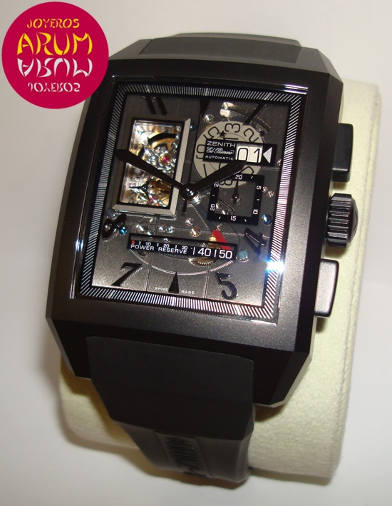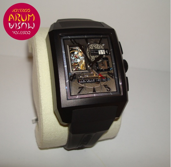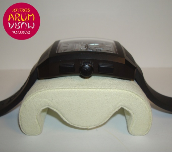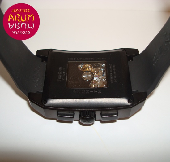Description :titanium, dark gray dial, composites of polymethylmethacrylate (PMMA), automatic movement, chronograph,minute indicator, date, power reserve indicator 50 hours, screwed crown and two buttons to the right, waterproof 50 meters, diameter 40 mm , transparent caseback, rubber strap, titanium folding clasp.