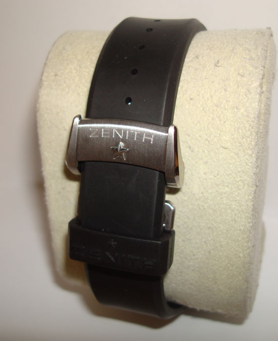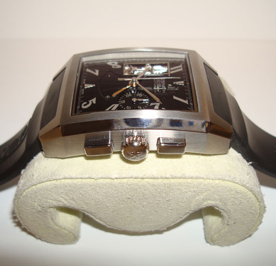 Description :steel, sapphire crystal, black dial, automatic movement, chronograph, power reserve indicator, diameter 36 mm by 41 mm, screw crown and two buttons, transparent caseback, rubber strap, steel folding clasp.