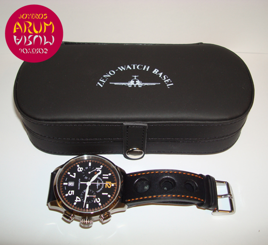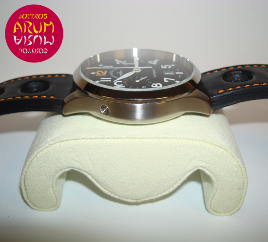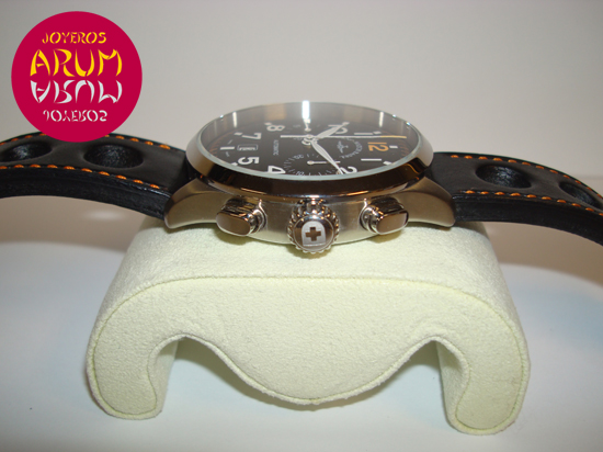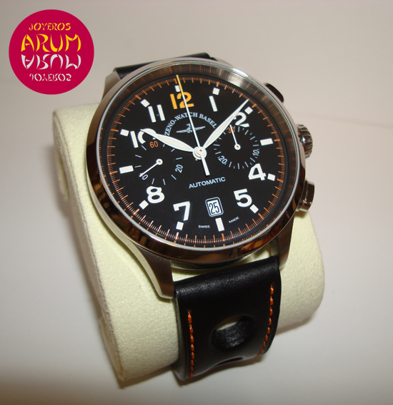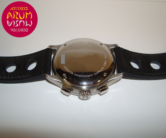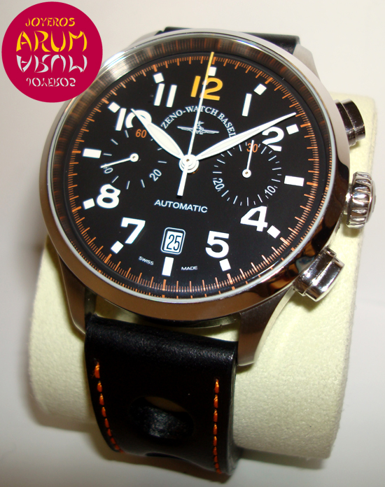 Description :steel, black dial with arabic numerals, smooth bezel, sapphire crystal, automatic movement, chronograph, two indicators on the dial, seconds and minutes, date at six, handles and luminescent dial, screw crown and two buttons, diameter 44 mm, black leather strap, steel buckle closure.