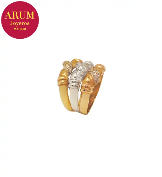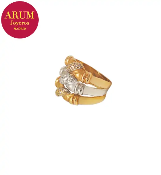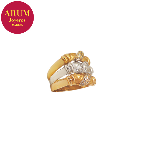 Producto: Anillo 3 Oros Referencia Tienda: RAI112 Descripción: Anillo realizado en oro amarillo, blanco y rosa de 18K con brillantes. Peso 7,09 grs. Talla:16 Estado: Como nuevo, con estuche de joyería.
