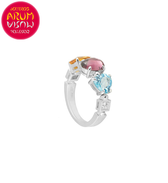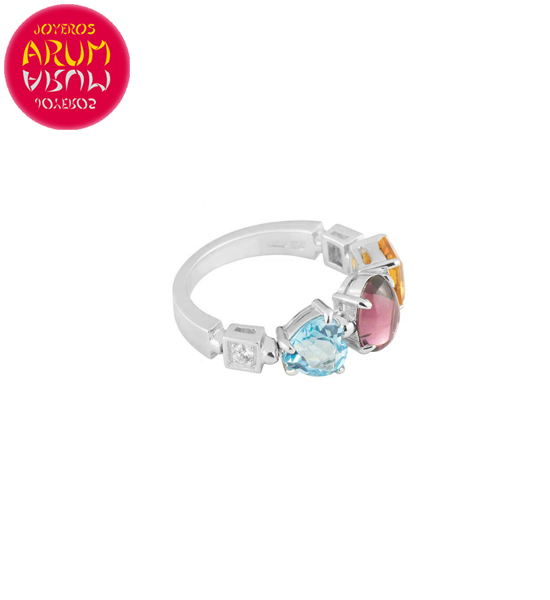 Descripción: Anillo de la prestigiosa firma de joyería Bulgari, perteneciente a la colección Allegra, realizado en oro blanco de 18K, con dos diamantes talla brillante de 0,08 qts a los lados y tres piedras preciosas en el centro, una turmalina, un citrino y un topacio.