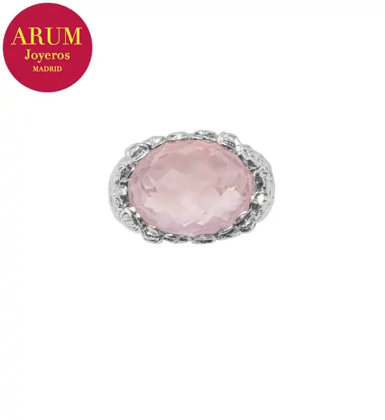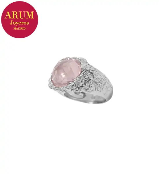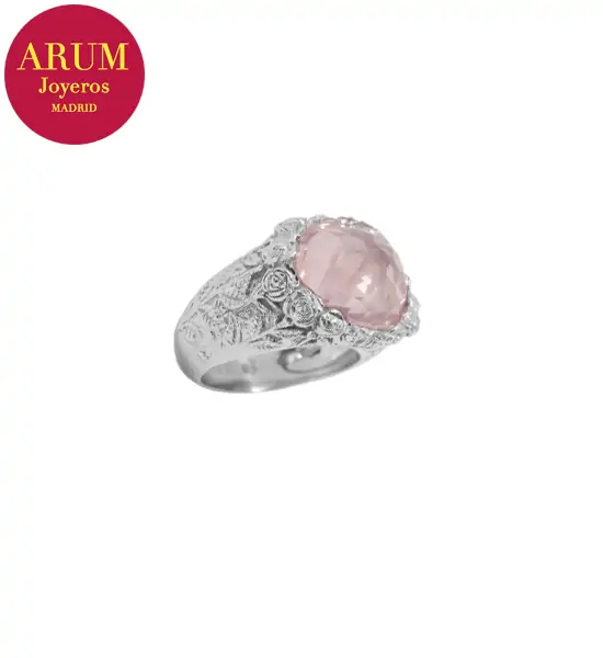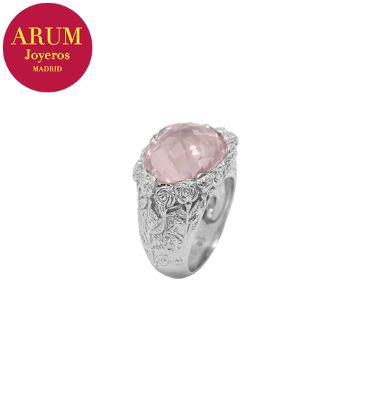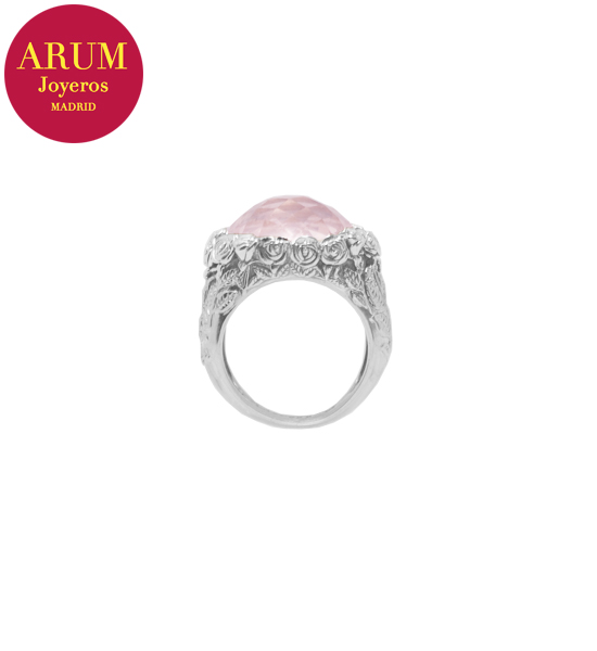 Descripción: Anillo de la prestigiosa firma de joyería Carrera y Carrera, con motivos florales, realizado en oro blanco de 18K con un cuarzo rosa. Peso 12,64 grs.