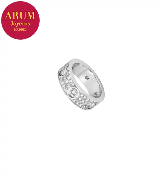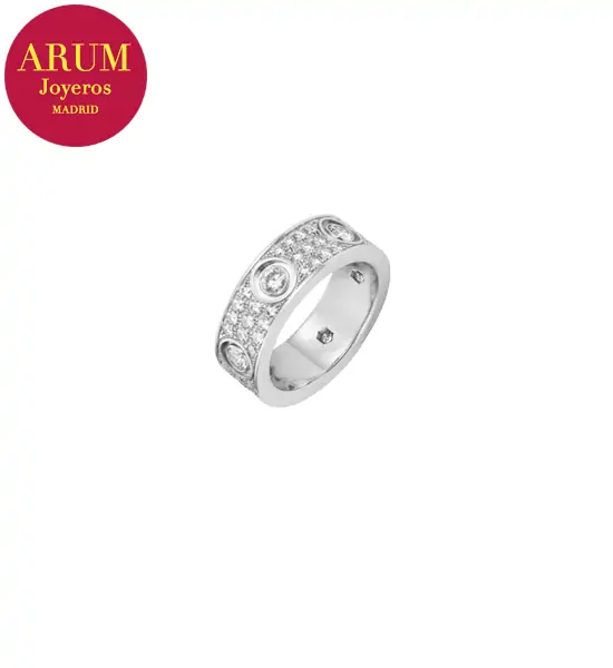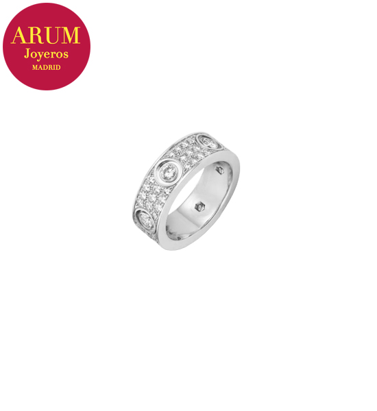 Descripción: Anillo de la prestigiosa firma de joyería Cartier, perteneciente a la colección Love, realizado en oro blanco de 18K y engastada con 72 diamantes talla brillante para un total de 1,26 qts. Peso 9,9 grs.