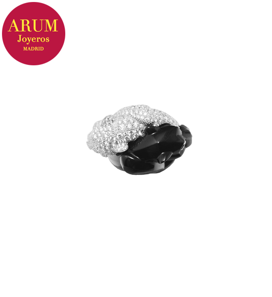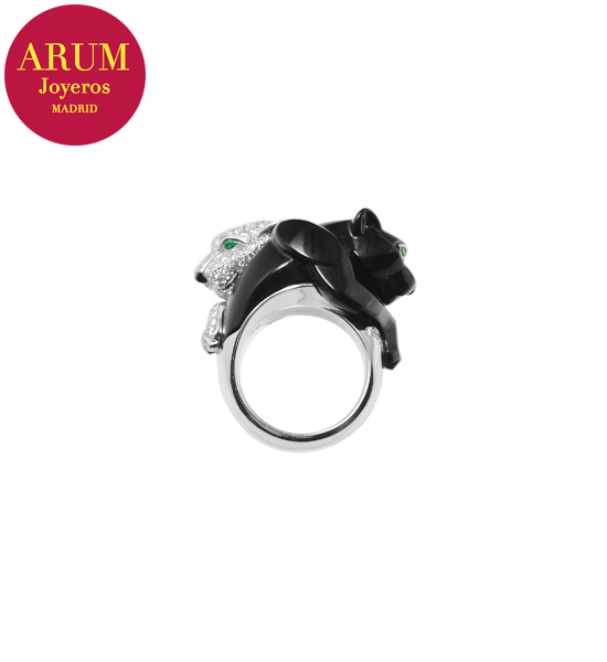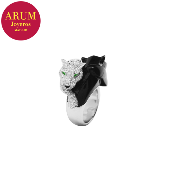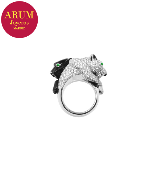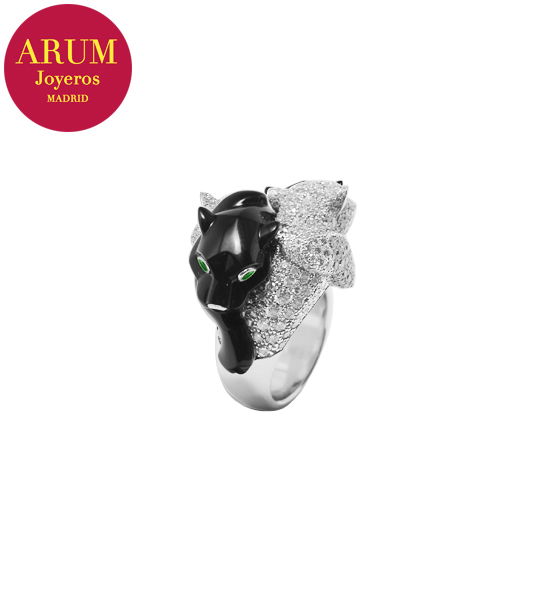 Descripción: Anillo de la prestigiosa firma de joyería Cartier, con dos panteras, realizado en oro blanco de 18K, diamantes talla brillante, onix y granates tsavoritas en los ojos. Peso 25,1 grs.