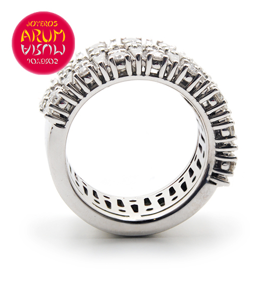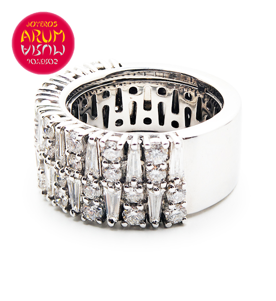 Descripción: Anillo de 1 cm de grosor, realizado en oro blanco de 18K con 34 brillantes talla redonda y 17 brillantes talla baguette, de 3,09 qts.