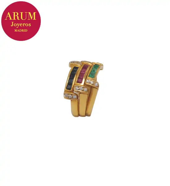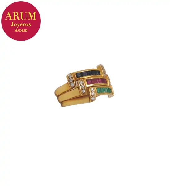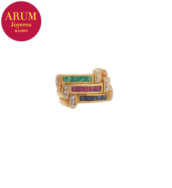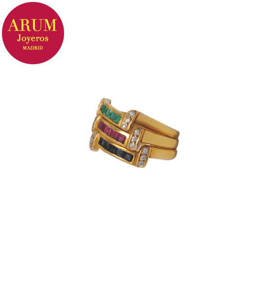 Descripción: Anillo realizado en oro amarillo de 18K con brillantes, esmeraldas, rubís y zafiros. Peso 5,84 grs.