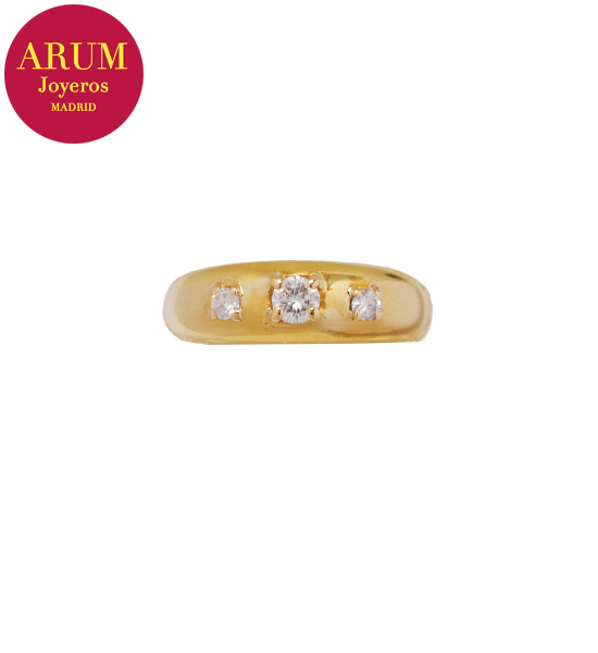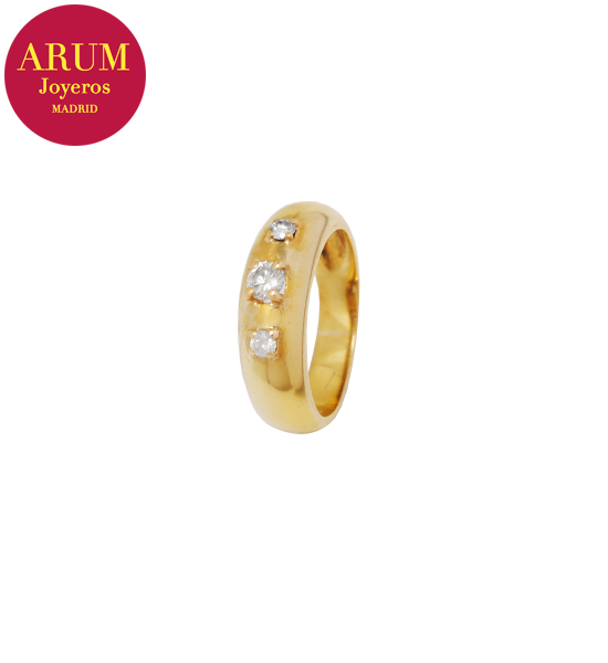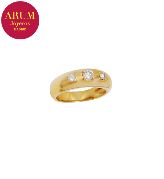 Descripción: Anillo realizado en oro amarillo de 18K con un diamante central talla brillante de 0,20 qts y dos diamates talla brillante de 0,07 qts cada uno. Peso 5,12 grs