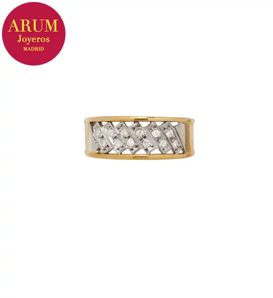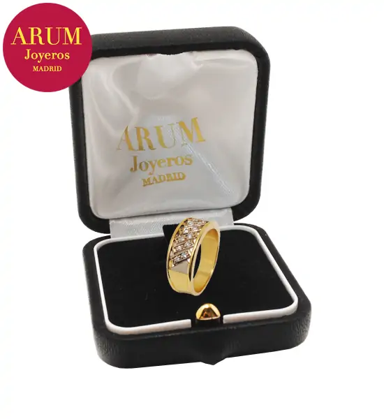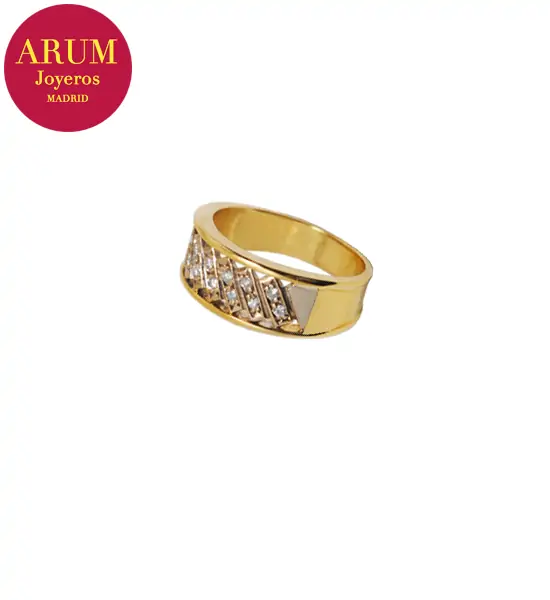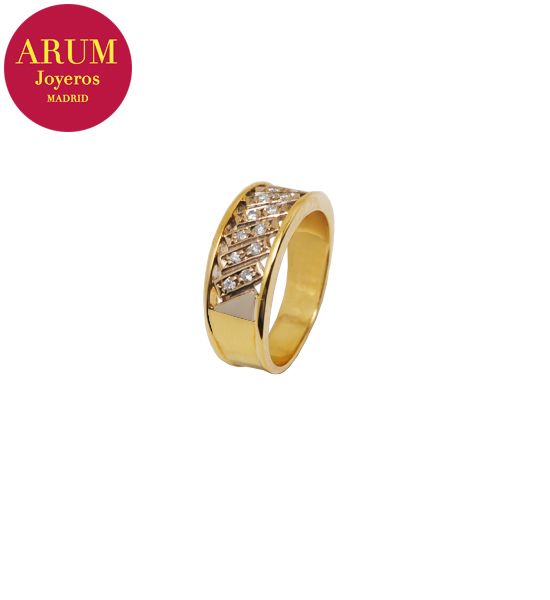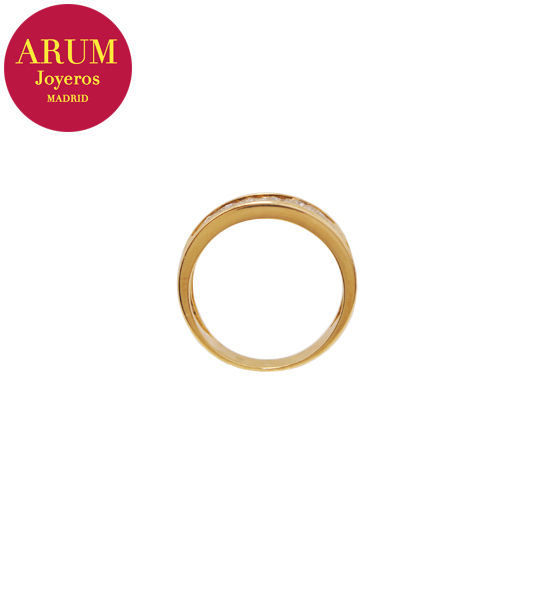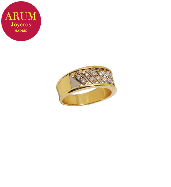 Descripción: Anillo ancho realizado en oro amarillo de 18K con brillantes. Peso 4,58 grs.