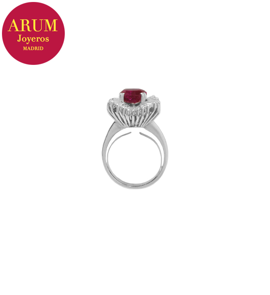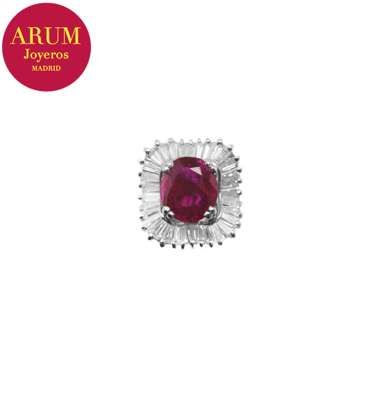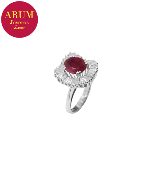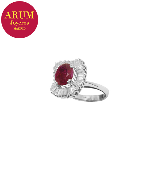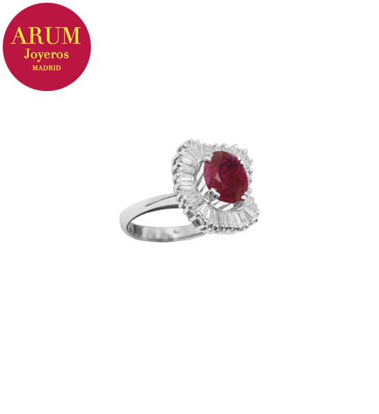 Descripción: Anillo estilo rosetón realizado en oro blanco de 18K con un rubí central de talla oval de 2.00 qts y brillantes talla princesa. Peso 5,96 grs.