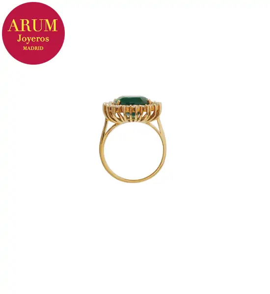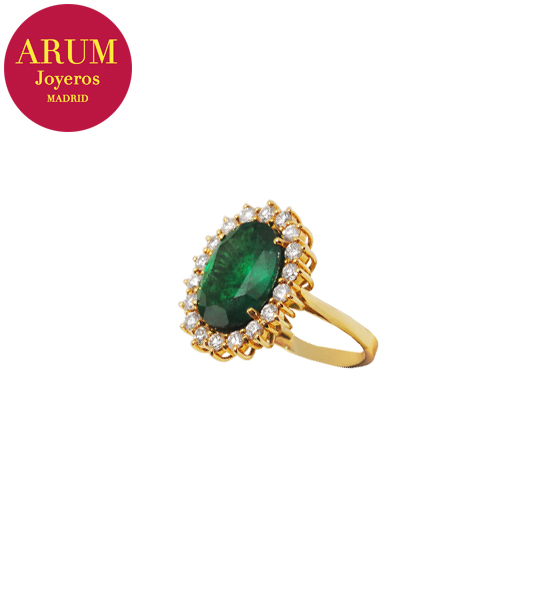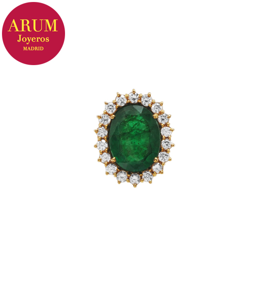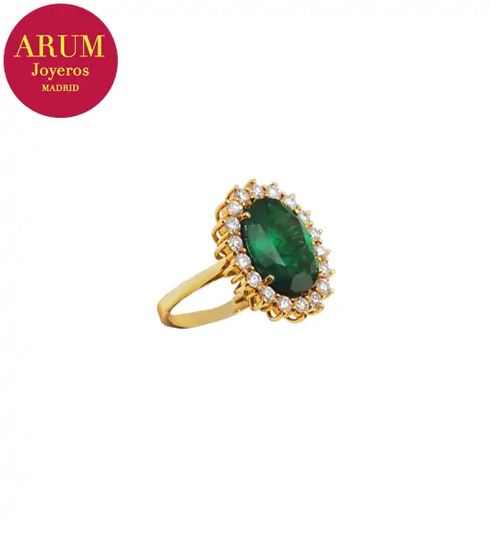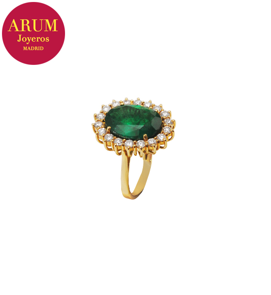 Descripción: Anillo realizado en oro amarillo de 18K con una esmeralda central de 5 qts. aprox. y 18 diamantes talla brillante de 0,05 qts cada uno.
