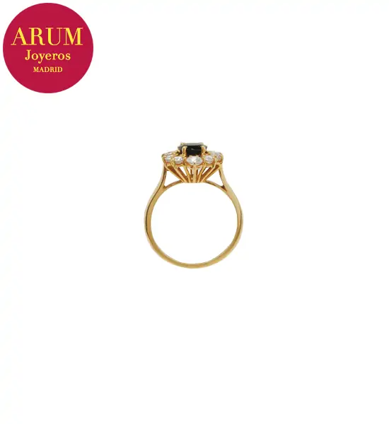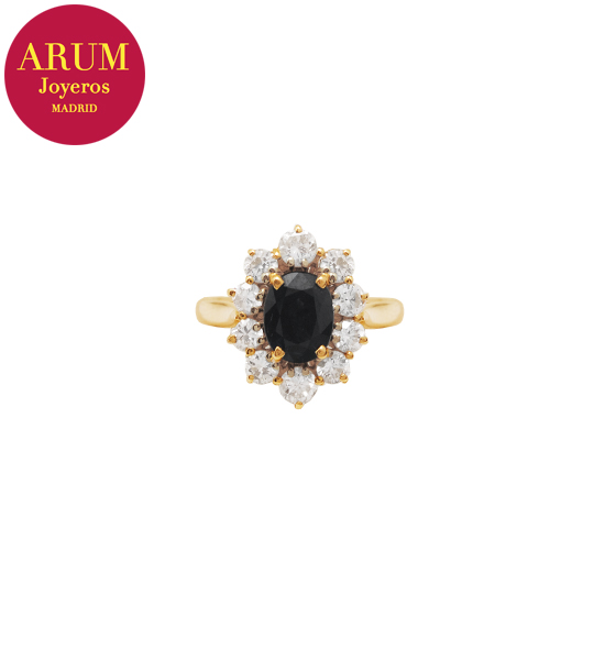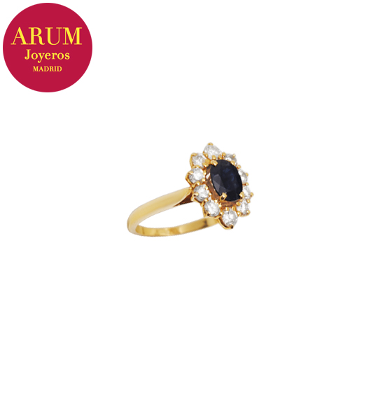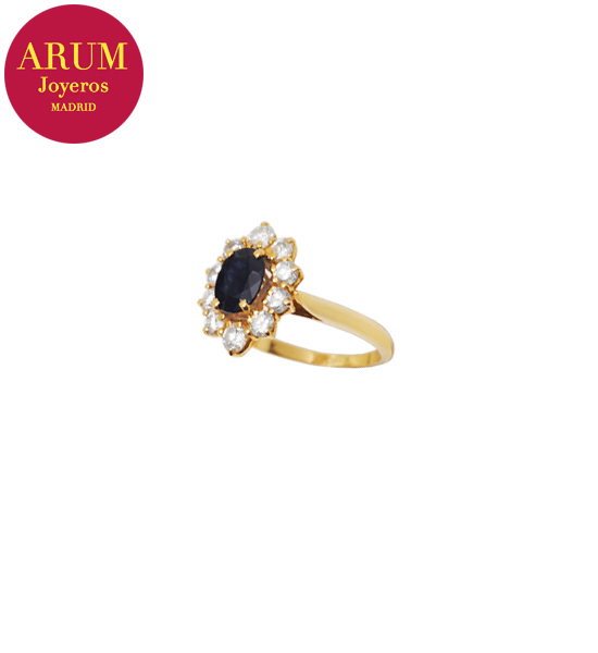 Descripción: Anillo realizado en oro amarillo de 18K con un zafiro central y diez diamantes talla brillante. Peso 3,75 grs.