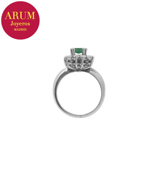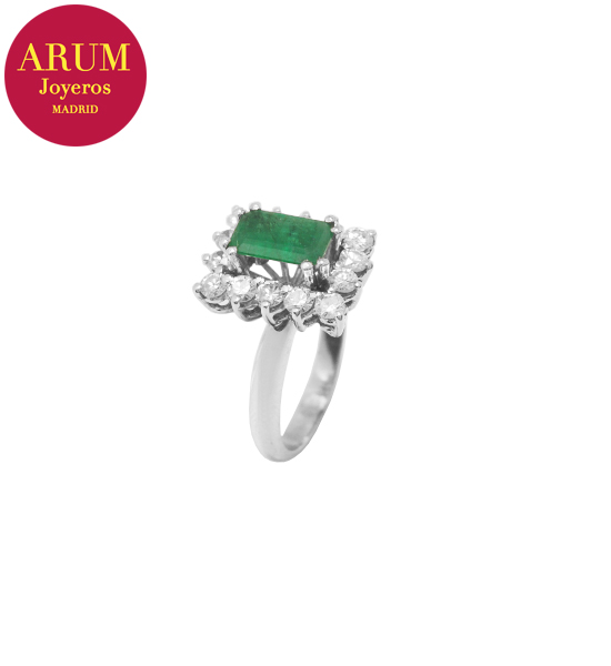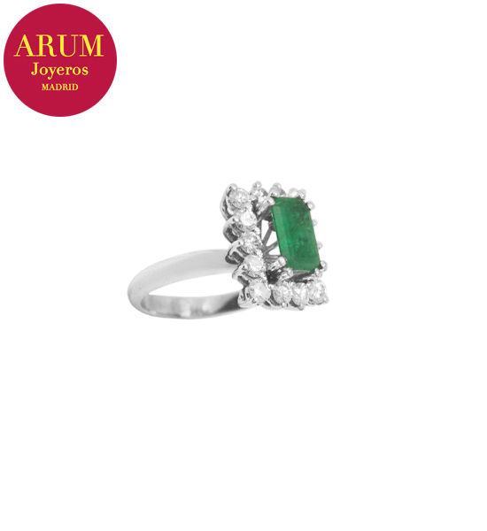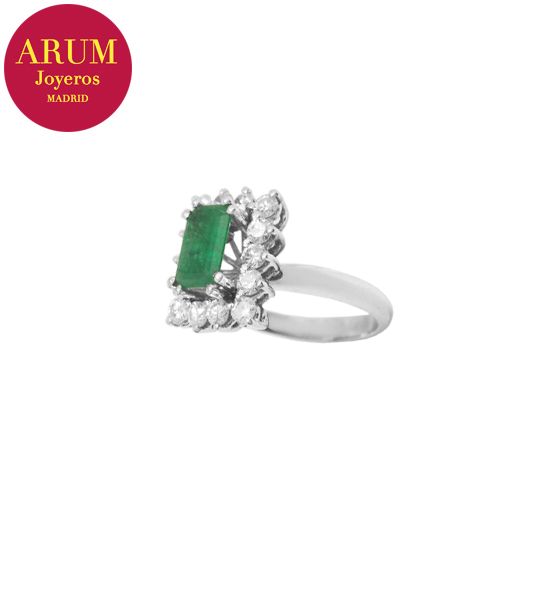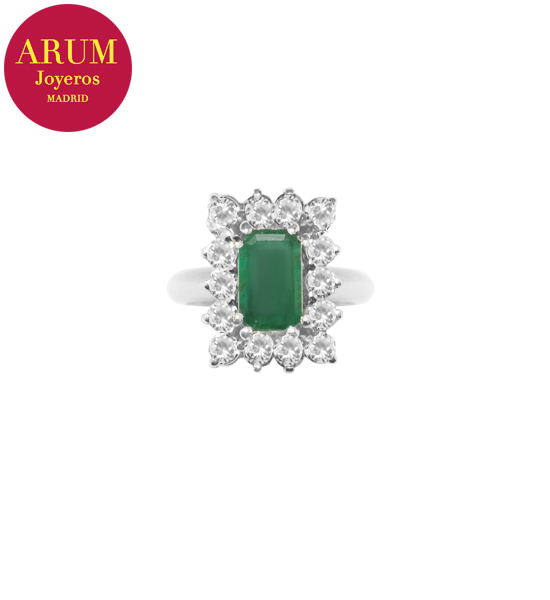 Descripción: Anillo realizado en oro blanco de 18K con una esmeralda central de 1,5 qts y 14 diamantes talla brillante de 0,10 qts. Peso 7,3 grs.
