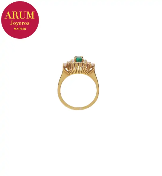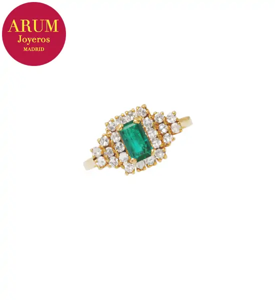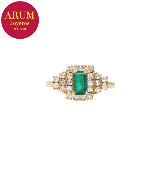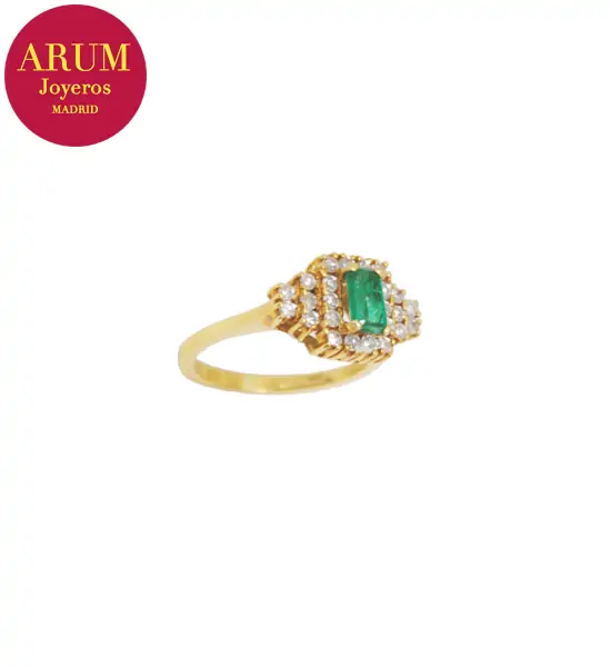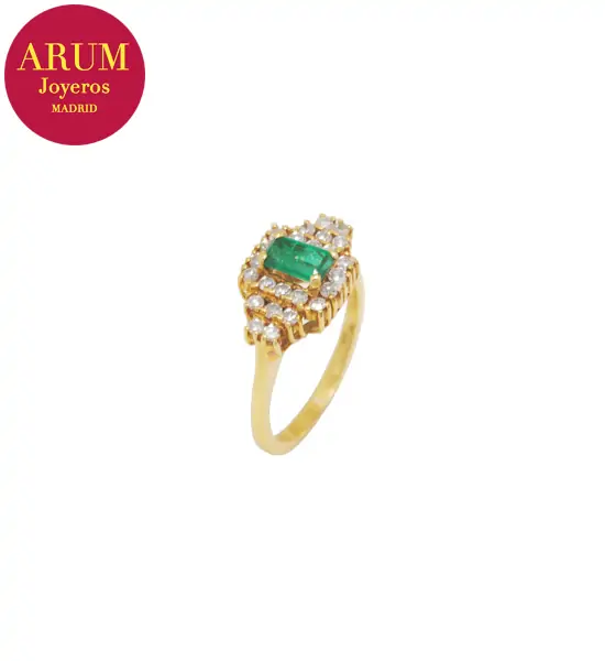 Descripción: Anillo realizado en oro amarillo de 18K con una esmeralda central y brillantes. Peso 3,94 grs.
