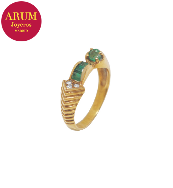 Descripción: Anillo realizado en oro amarillo de 18K con una esmeralda redonda, cuatro esmeraldas carré y tres brillantes. Peso 3,63 grs.