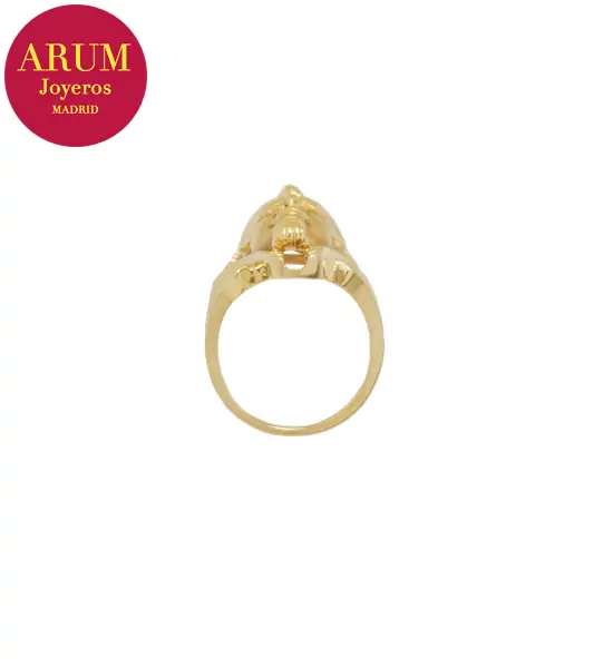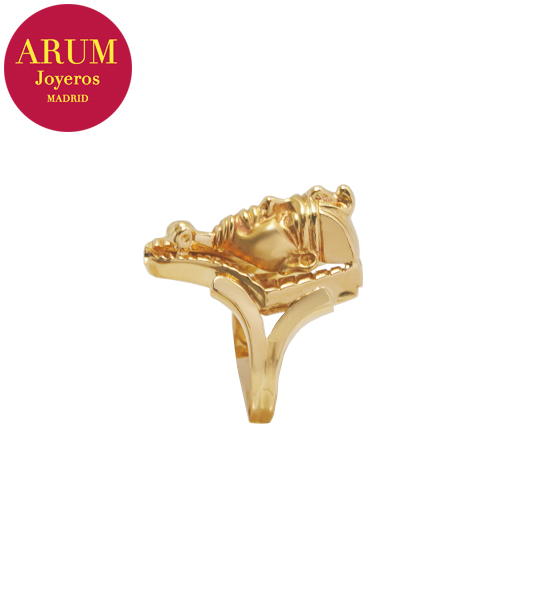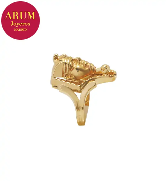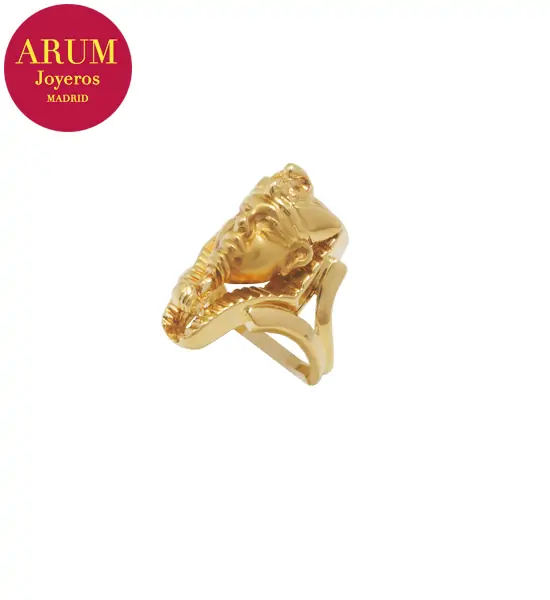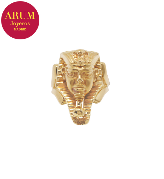 Descripción: Anillo realizado en oro amarillo de 18K con forma de faraón egipcio . Peso 12,25 grs. Medidas 2,5 por 1,5 cm.