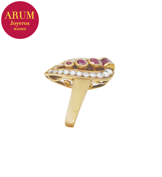 Descripción: Anillo realizado en amarillo de 18K con 19 diamantes en talla brillante (Color G, pureza Vs1) de aproximadamente 0,90 qts. en total, con tres rubis en talla brillante y tres rubis pequeños en talla carré. Peso total 9 grs.