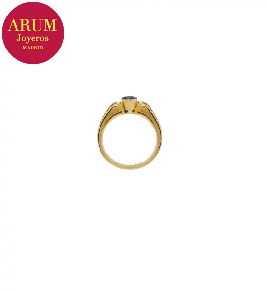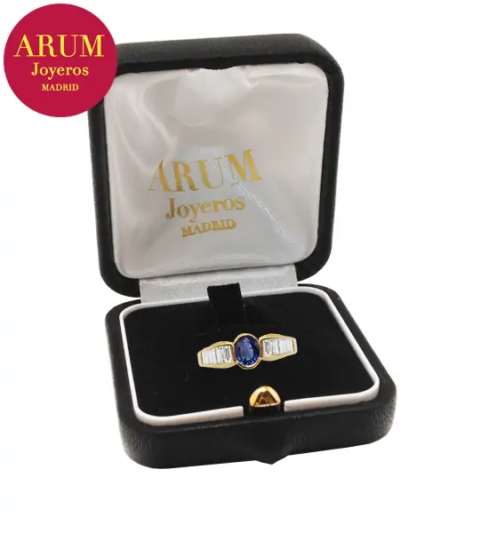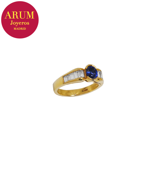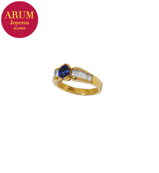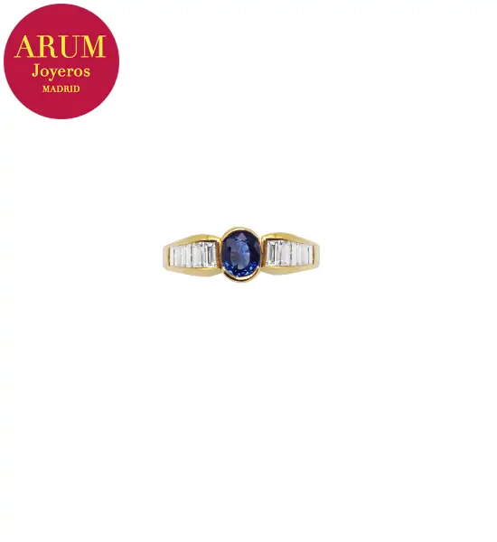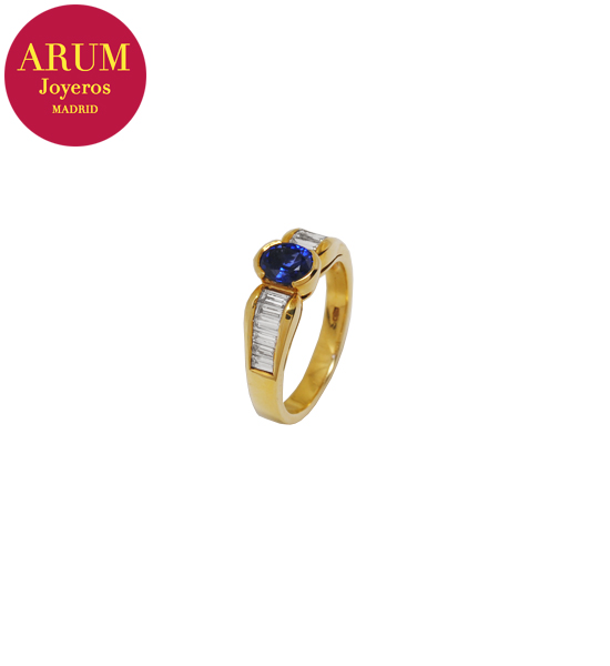 Descripción: Anillo realizado en oro amarillo de 18K con un zafiro central de 0.40 qts. aprox y brillantes talla bagués a los lados.