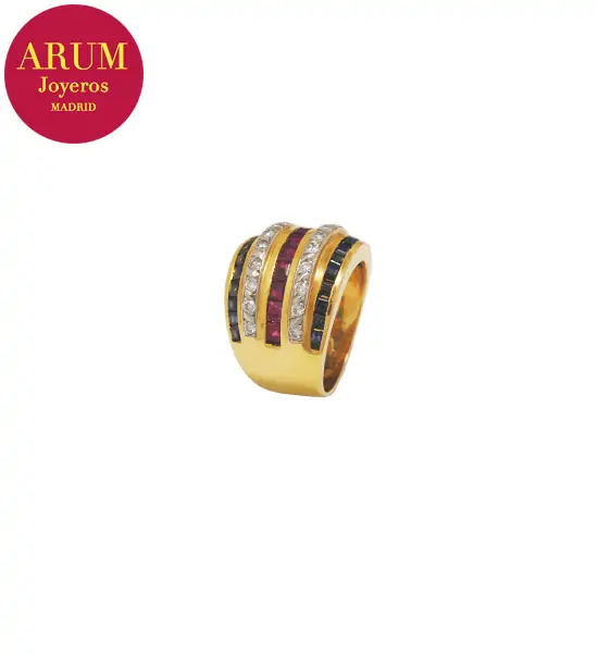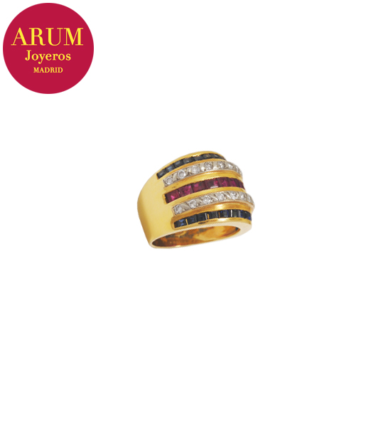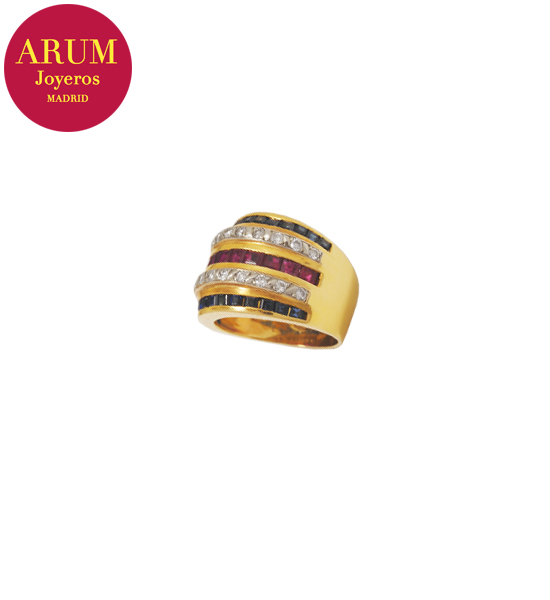 Descripción: Anillo realizado en oro amarillo de 18K con brillantes, rubís y zafiros. Peso 11,14 grs.