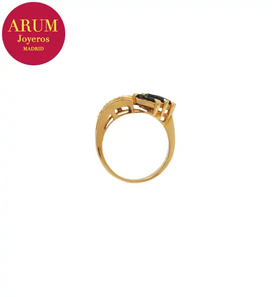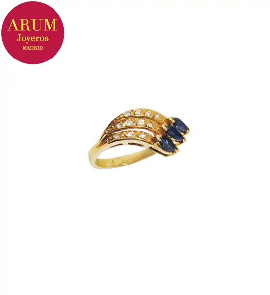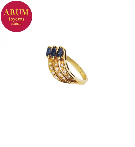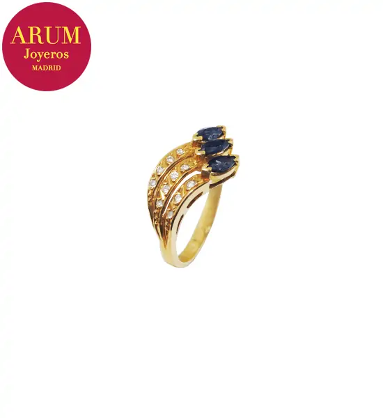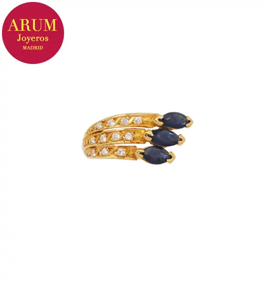 Descripción: Anillo realizado en oro amarillo de 18K con brillantes y tres zafiros. Peso 3,83 grs.
