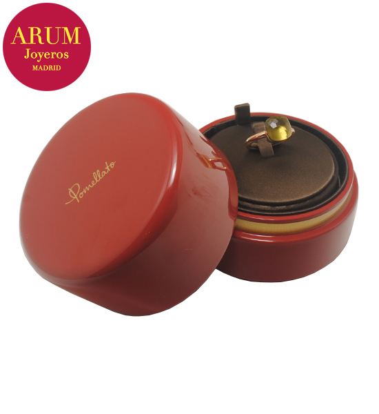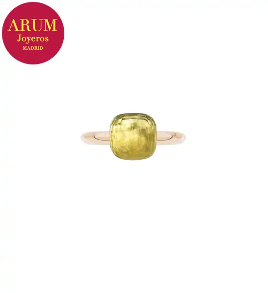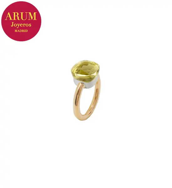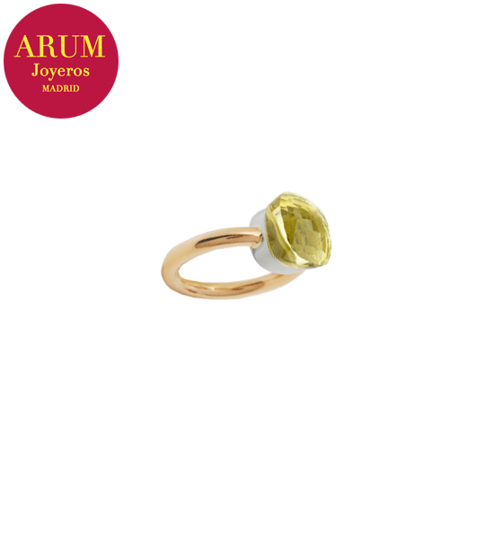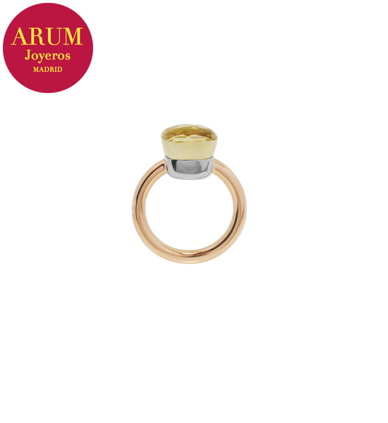 Descripción: Anillo de la prestigiosa firma de joyería Pomellato realizado en oro rosa y oro blanco de 18K, con un cuarzo limón facetado. Peso 7,16 grs.