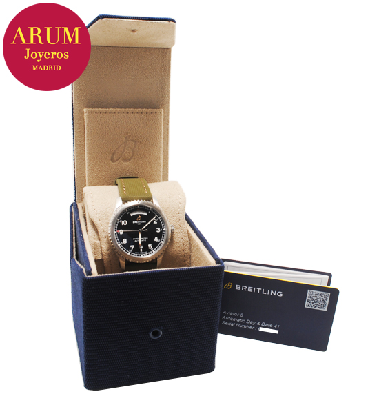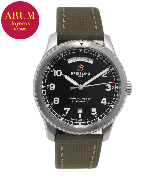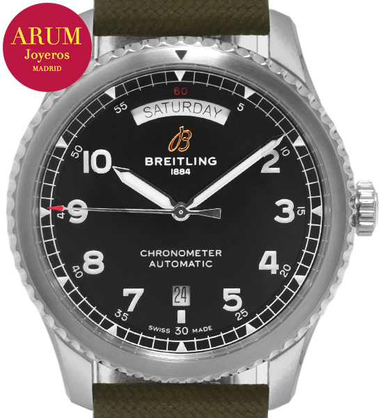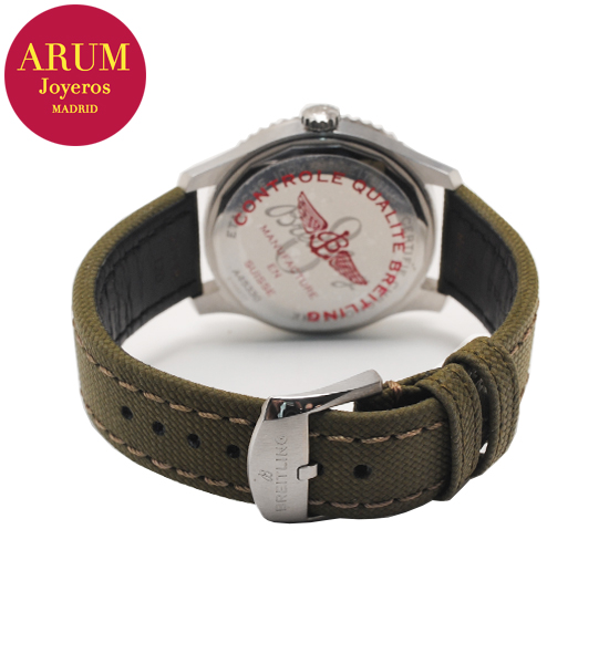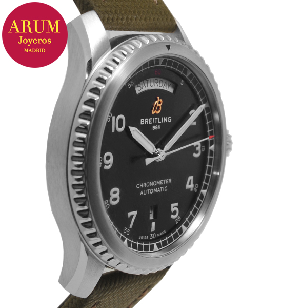 Otras especificaciones :calibre Breitling 45, reserva de marcha de 38 horas, fecha y dia de la semana, segundero central, marcas luminiscentes, bisel giratorio bidireccional, corona a rosca.