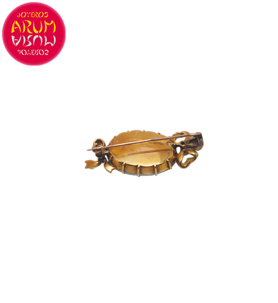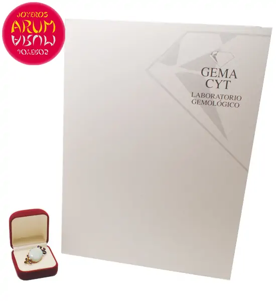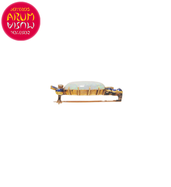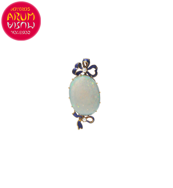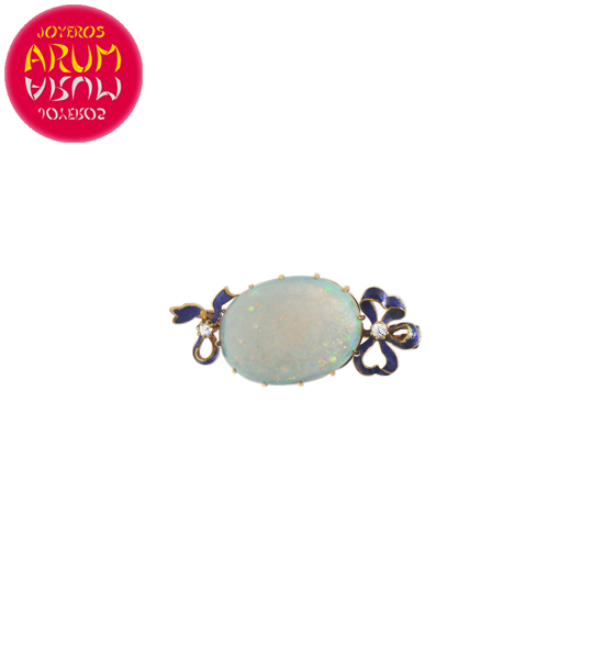 Descripción: Broche compuesto por un ópalo blanco natural talla cabujón oval, engastado en garras con un peso estimado de 13 qts. Dos diamantes talla brillante antigua con un peso total de 0.13 qts. (Color G-H, Pureza SI-SI2) y decorado con dos lazos realizados en esmalte azul.