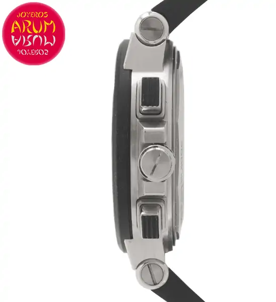Otras especificaciones :62 brillantes en el bisel y en la esfera (peso total 2,17 qts.), cronógrafo, fecha entre las cuatro y las cinco, segundero pequeño a las tres, manillas con marcas luminiscentes, corona a rosca.