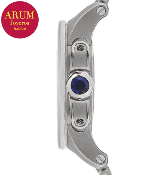 Otras especificaciones :calibre Cartier 1904-PS MC, reserva de marcha de 48 horas, fecha a las tres, segundero pequeño a las seis, marcas luminiscentes, corona engastada con una espinela azul.