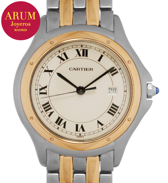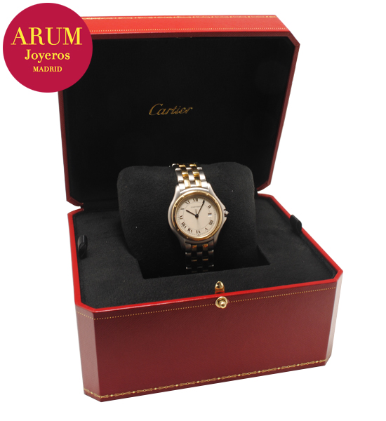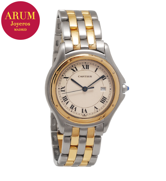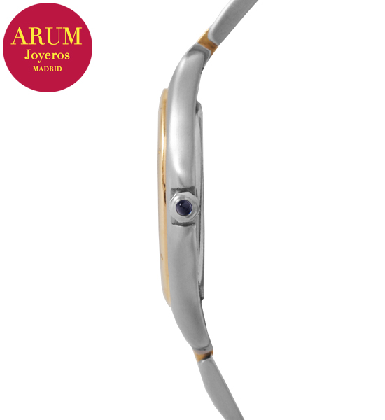 Otras especificaciones :fecha a las tres, segundero central, agujas de acero azulado, corona decorada con una espinela azul, acero y oro de 18K.