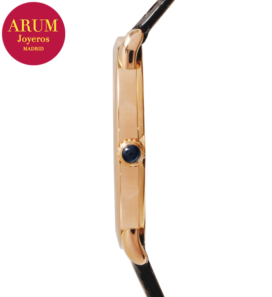 Otras especificaciones :caja y hebilla realizadas en oro de 18K, agujas de acero azulado, corona decorada con una espinela de color azul, tapa trasera transparente con cristal de zafiro.