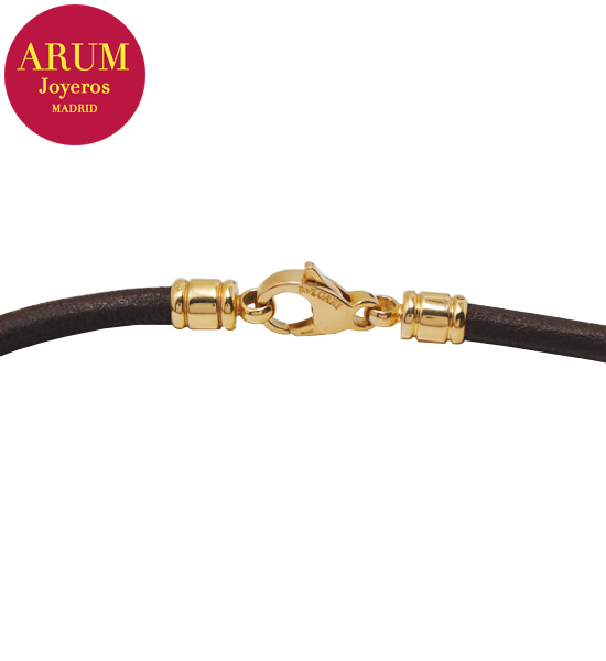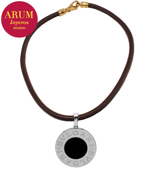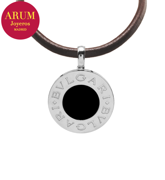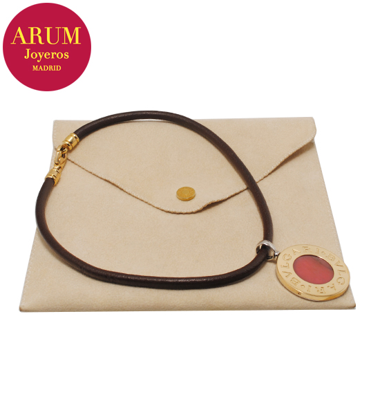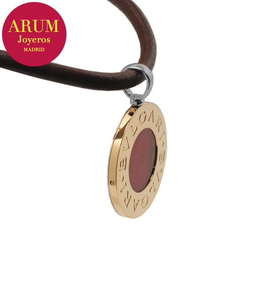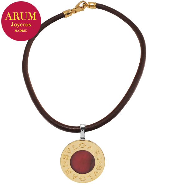 Descripción: Colgante de doble cara de la prestigiosa firma de joyería Bulgari, realizado en oro amarillo de 18K y cornalina por un lado y de acero y onix por el otro lado. El colgante va con un cordón de piel color marrón con un cierre realizado en oro de 18K. El diámetro del colgante es de 3,5 cm y pesa 18,9 grs.