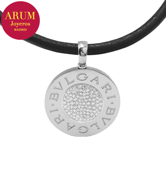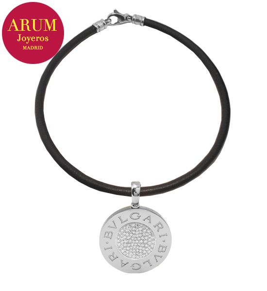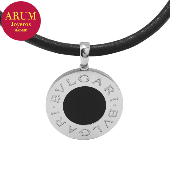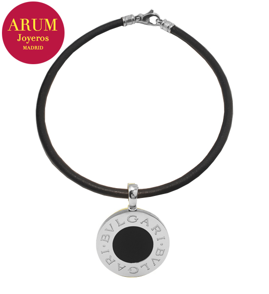 Descripción: Colgante de doble cara, de la prestigiosa firma de joyería Bulgari, perteneciente a la colección Tondo, realizado en acero, pavé de brillantes y onix. Incluye un cordón negro de cuero, con cierre de pinza de langosta. El diámetro del colgante es de 3,5 cm.