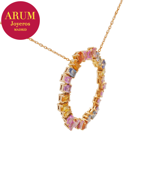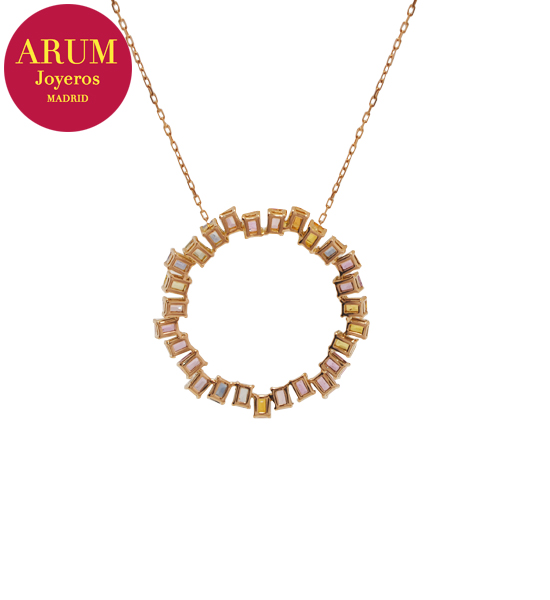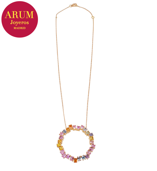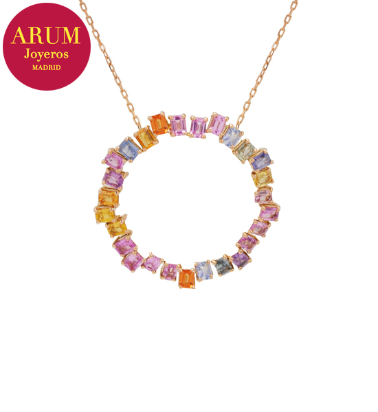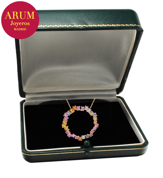 Descripción: Cadena y colgante realizados en oro rosa de 18K, con piedras preciosas (amatistas, topacios, aguamarinas). La cadena mide de largo 40 cm y el colgante 3,7 cm de diámetro. Peso total 10 grs.