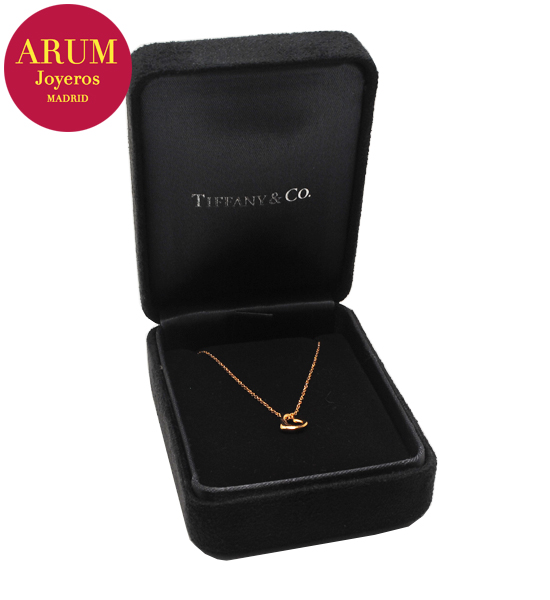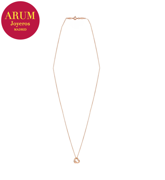 Descripción: Cadena y colgante de la prestigiosa firma de joyería Tiffany & Co perteneciente a la colección Open Heart diseñado por Elsa Peretti, realizado en oro rosa de 18K. El pequeño colgante en forma de corazón mide 7 mm. La cadena mide 40 cm de largo. Peso 1,56 grs.